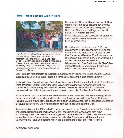 In der Vergangenheit freuten sich zudem bereits ein Mechernicher Kindergarten, die Jungfeuerwehr Kommern, die „Lebenshilfe Rhein-Erft-Kreis Süd“ und der Hospizverein in Erftstadt über die Hilfsbereitschaft der Triker.